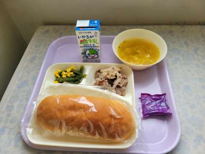 本日の給食は、豚肉のガーリック焼き、スープ、さんどまめとコーンのサラダでした。