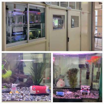 本校の管理作業員室で金魚やどじょうなど生き物のお世話をしてくれています。時折子どもたちが集まって癒されているようです。