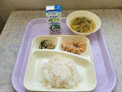 本日の給食は、鶏肉のからあげ、中華スープ、チンゲンサイともやしの甘酢あえです。