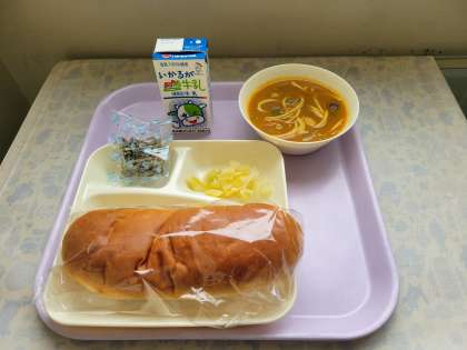本日の給食は、カレースープスパゲッティ、キャベツのピクルス、ミニフィッシュです。パンはさつまいもを混ぜ込んだ甘い味になっており、そのまま食べてもおいしいですが、
