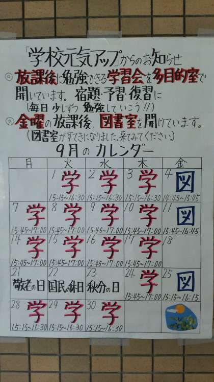 9月も連日学校元気アップ活動をしています。自主学習会や図書館開放などです。生徒のみなさんは、どんどん利用してください。