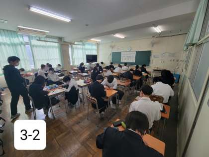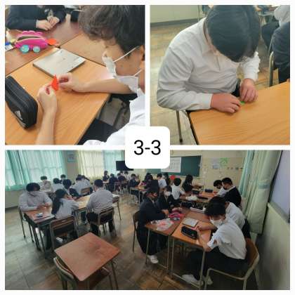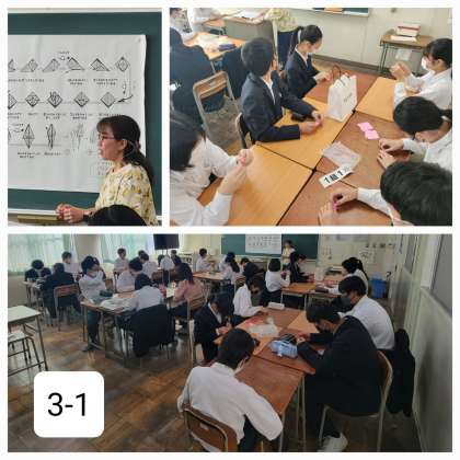 朝から3年生は、千羽鶴を折っています。6月の修学旅行へ向けての取組です。全員で千羽折るのはたいへんですが、平和の祈りを込めて作ってくださいね。