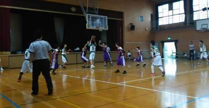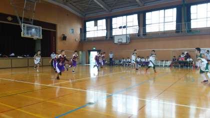 男子バスケットボール部の公式戦のようすです。男子の試合だけに、力強く激しい展開となりました。チームがひとつになり、力を合わせて全力で頑張りました。