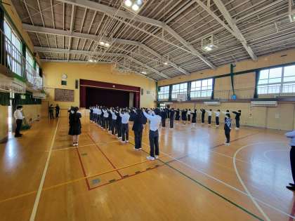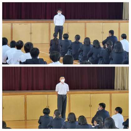 本日は朝から2年生が、学年集会を行っています。代表の生徒から、今日からテスト1週間前ですが、これからは1週間前からやるのではなく普段から勉強する習慣をつけましょうとお話をしてくれました。また、担当の先生からは、1週間前になると必ずテスト計画をたてますが、その大切さについてのお話がありました。