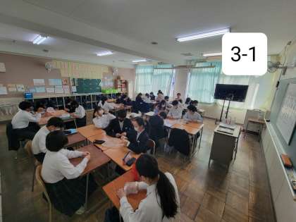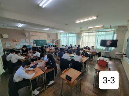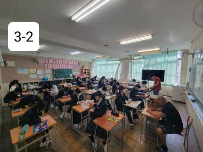 昨日に引き続き、3年生では千羽鶴を折っています。慣れた手つきで折っている人もいれば、ここからどうすんだったかなと黒板に貼ってある手順を見ながら折っている人もいました。