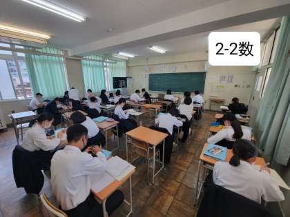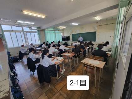 本日の2年生の授業のようすです。体育では、男子がハンドボール投げ、女子は写真には写っていませんがシャトルランが行われていました。走りきった後の整列の写真となっていてすいません。