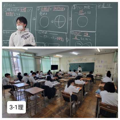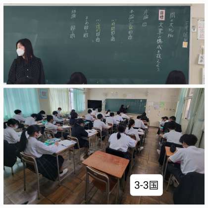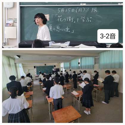 本日の3年生の授業のようすです。先生の質問に積極的に発言している人もいました。音楽の時間では、「夏の思い出」と校歌を歌っていました。高いパート、低いパートがありますが得意な方を選んで歌っていました。理科の時間では、遺伝の学習でした。