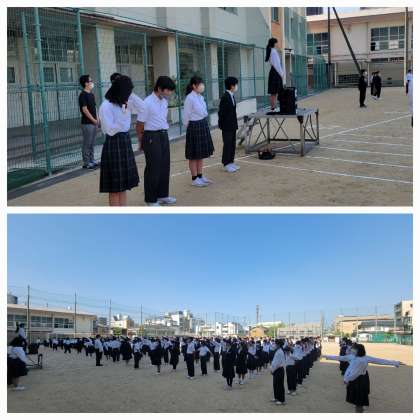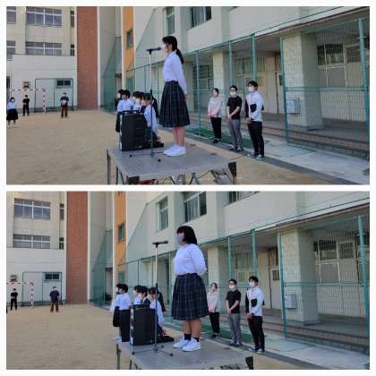 本日は、雲一つない晴天のもと全校集会を行いました。校長先生のお話のあと、各委員会代表の人から今月の目標を発表してくれました。
