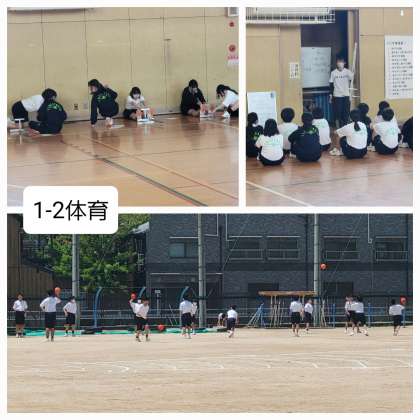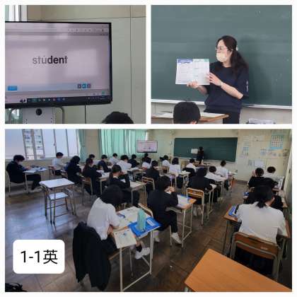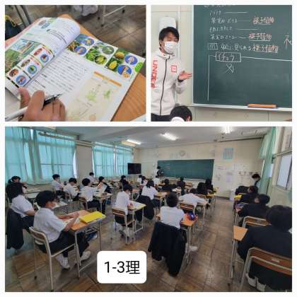 本日の1年生の授業のようすです。英語の授業では、みんなで大きな声で英単語の発音の練習をしていました。理科の授業では、被子植物と裸子植物について学んでいました。体育では、男子はハンドボール投げ、女子は握力と体前屈の測定をしていました。