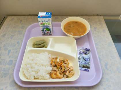本日の給食は、かやくご飯、みそ汁、まっ茶ういろうです。