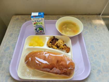 本日の給食は、カレードリア、豚肉とキャベツのスープ、りんご(カット缶)、ブドウパンでした。