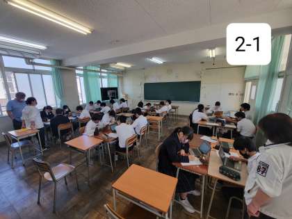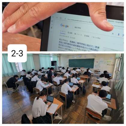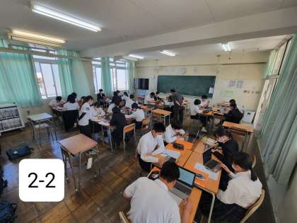 本日2年生は、総合の時間を利用して進路学習として、タブレットを使って進路の調べ学習をしています。高校の総合学科について調べて、プリントにまとめていました。
