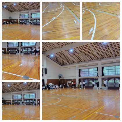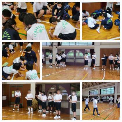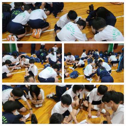 体育館で室内レクリエーションを行っています。次は、班対抗紙ひこうきとばし対決です。みんなで考えて、紙ひこうきを作っています。