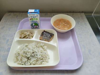 本日の給食は、さごしのつけ焼き、みそ汁、キャベツの赤じそあえでした。