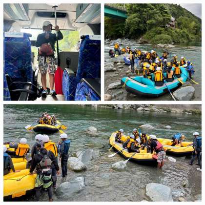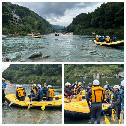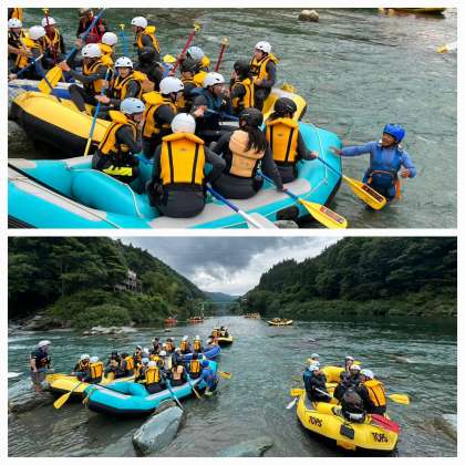 ラフティング体験のようすです。皆さん、テンションMAXで盛り上がっています。
