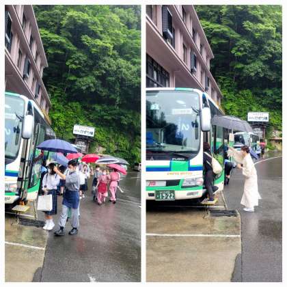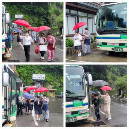 雨が降るなか、ホテルのスタッフの方がバスまでぬれないようにと傘をさして誘導してくれました。女将さんも率先してやってくれています。おこころづかい最後までありがとうございました。