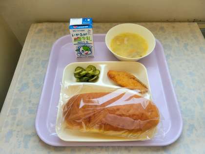 本日の給食は、サーモンフライ、豆乳スープ、きゅうりとバジル風味サラダでした。