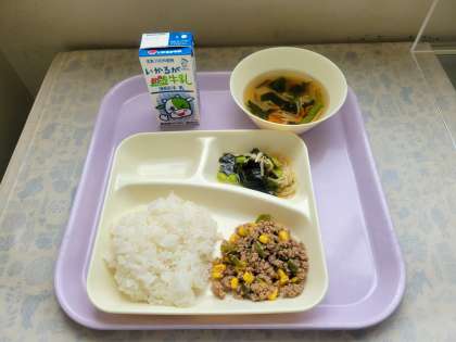 本日の給食は、3色丼、3色スープ、3色酢のものでした。すべてのメニューね「3」がついていますね。これは、令和4年度の学校給食コンクール優秀賞献立です。考えてくれた人、ありがとうございました。本当に3色丼が美味しかったです。