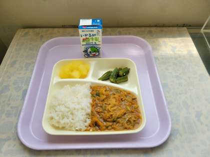 本日の給食は、和風カレー丼、オクラのかつお梅風味、りんご(カット缶)でした。