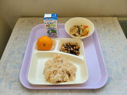本日の給食は、鶏肉と野菜の煮もの、ひしき豆、みかん(冷)でした。