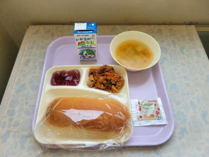 本日の給食は、なすのミートグラタン、スープ、ダイスゼリー(ぶどう)でした。