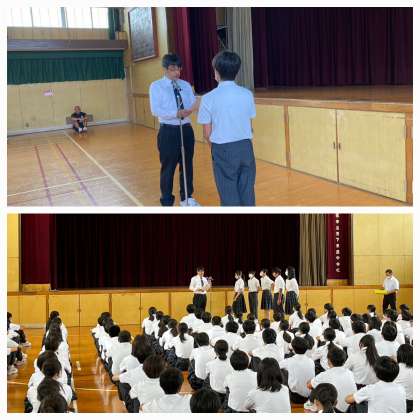 終業式では、校長先生がお話をしました。楽しみにしていた夏休みが始まりますが、ニュースでは交通事故や水の事故がよく報道されています。いろいろな事故に遭わないよう注意してください。そして2学期始業式に元気な姿を見せてください。また、夏休みは、部活動や外でのスポーツや習い事をしている人は、熱中症には十分に気をつけて、頑張ってください。