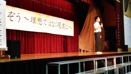 本日、文化発表会(舞台発表の部)を開催しました。下の写真は、生徒文化発表会実行委員会の伊藤委員長が、オープニングで全校生徒に話をしているところです。伊藤委員長からは、今年度のスローガン「そうぞう〜理想ではなく現実に〜」について説明があるとともに、全力を出し切り、一致団結できる文化発表会にしようとあいさつがありました。