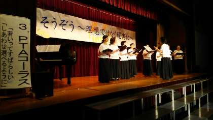PTAコーラスのようすです。昭和41年(1966年)のヒット曲『若いってすばらしい』と、平成7年(1995年)に発生した阪神・淡路大震災時に、神戸の復興を願って作られた『しあわせ運べるように』を熱唱してくださいました。