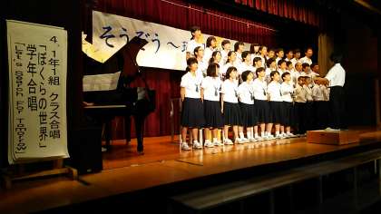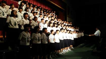 1年生の合唱の発表です。10月1日に、1年生で実施した合唱コンクールで優勝した1年1組がクラス合唱を行いました。また、1年生全員による学年合唱『Let's Search For Tomorrow』を元気よく発表しました。