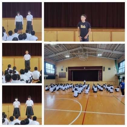 本日は朝から体育館で1年生が学年集会を行いました。先週行われた生徒委員会の代表の人から今月の目標を発表してくれていました。