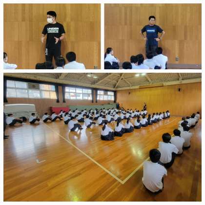 本日は朝から格技室で2年生が学年集会を行いました。担当の先生から来週実施の一泊移住が成功させるには皆さんの心構えが大切ですというお話やあいさつの大切さのお話がありました。
