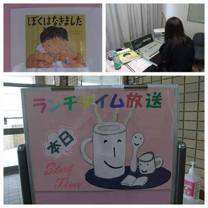 本日は給食時にお昼のランチタイム放送を行いました。普段お家で録音作業をしていただいているボランティアの方が夏休みに本をとりに学校へきてくれたときの写真です。