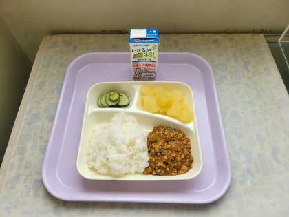 本日の給食は、大豆入りキーマカレーライス(米粉)、きゅうりのサラダ、洋なしでした。