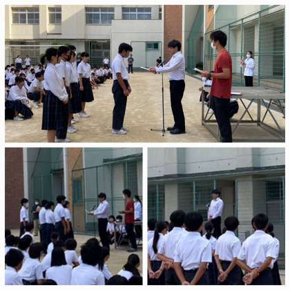 本日は朝から全校集会で、後期生徒会役員の認証式を行いました。前期生徒会役員の皆さん、今までご苦労さまでした。学校のため、仲間のためにいろいろ活躍してくれました。ありがとうございました。