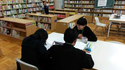 元気アップ活動で、中間テスト前の強化学習会が始まりました。参加した生徒は、分からないところをボランティアさんに質問し、個別指導を受けていました。