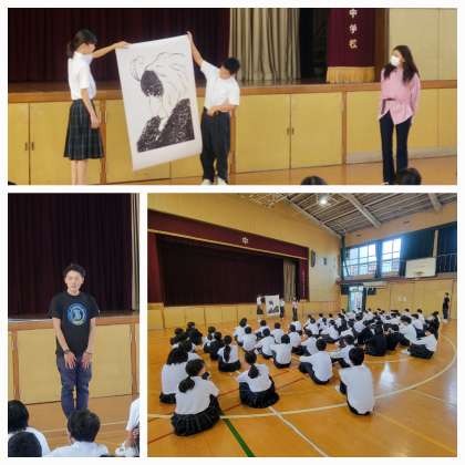 本日は、朝から1年生が体育館で学年集会を行いました。担当の先生が拡大された絵を用意してくれており、何に見えるかという問いかけがありました。
