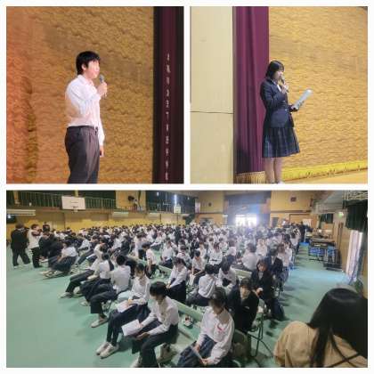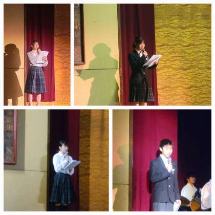 本日は、文化発表会の舞台発表の部を行いました。新旧生徒会の人が合同で司会進行をしてくれています。よろしくお願いします。