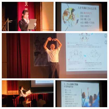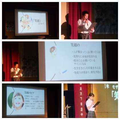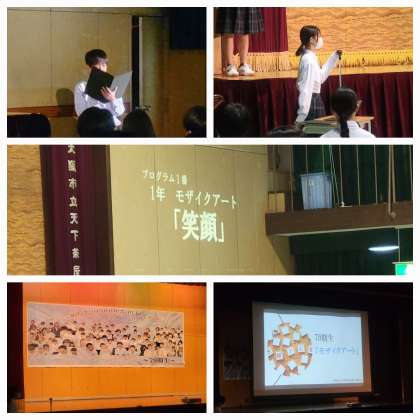 まずはじめに1年生の発表です。ます目を色ペンで塗っていくことで大きな絵が完成するモザイクアートを作成してくれました。また、笑顔をテーマに素敵な発表してくれました。