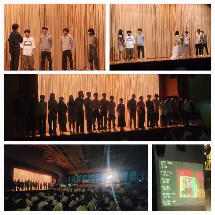 最後に3年生の発表です。修学旅行で体験してきた平和学習をテーマに原爆の悲惨さや平和について、さすが3年生という迫力ある演技をしてくれました。