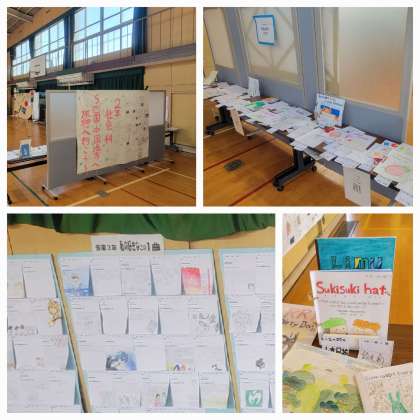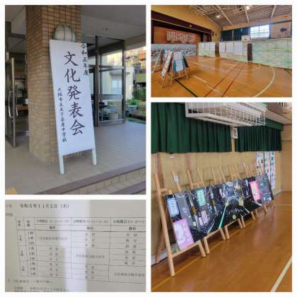 本日は、文化発表会の展示の部です。体育館内に文化部、委員会、教科、学年の舞台劇で使用した大道具小道具が展示され、学年ごとに見学しました。