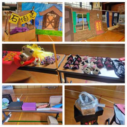 本日は、文化発表会の展示の部です。体育館内に文化部、委員会、教科、学年の舞台劇で使用した大道具小道具が展示され、学年ごとに見学しました。