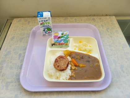昨日の給食は、ハンバーグカレーライス、カリフラワーのピクルス、豆こんぶでした。カレーライスは人気メニューの一つで、みんなモリモリ食べていました。
