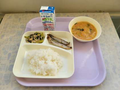 本日の給食は、焼きししゃも、みそ汁、こまつなの炒め物でした。みなさんは、ししゃもは頭から食べますか?食べないという人は、少し苦味もありますが、栄養もありますので、ぜひチャレンジしてみてください。