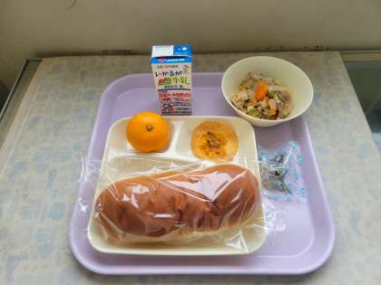 本日の給食は、豚肉と野菜のスープ煮、変わりピザ、みかん、ミニフィッシュでした。