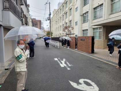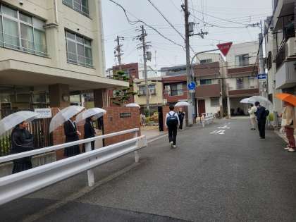 本日の朝登校のようすです。昨日から本格的に寒くなってきました。そのうえ雨が降ってきていました。寒い中、朝のおはよう運動に地域の方が参加してくれていました。