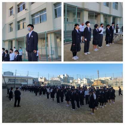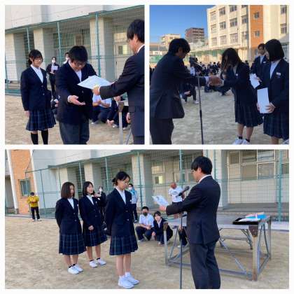 本日は、朝からグラウンドで全校集会を行いました。女子バスケ部と美術部の表彰伝達を行いました。女子バスケ部は、西成区の大会での優勝と最優秀選手の受賞でした。おめでとうございます。美術部の人は絵画作品の受賞で記念品も贈呈されました。おめでとうございます。