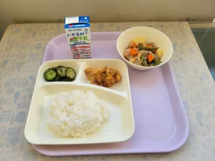 本日の給食は、あげどりのねぎだれかけ、豚肉とじゃがいもの煮もの、きゅうりの赤じそあえでした。あげどりのねぎだれかけは味つけがよくごはんがすすみました。豚肉とじゃがいもの煮ものも具だくさんで美味しかったです。