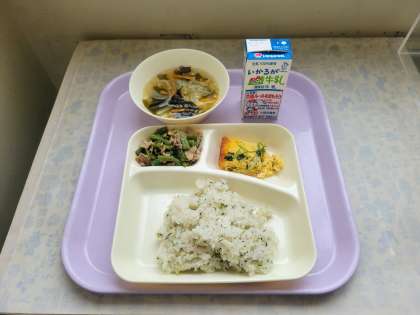 本日の給食は、具だくさん卵の千草焼き、五目汁、豚肉とさんどまめのいためものでした。
