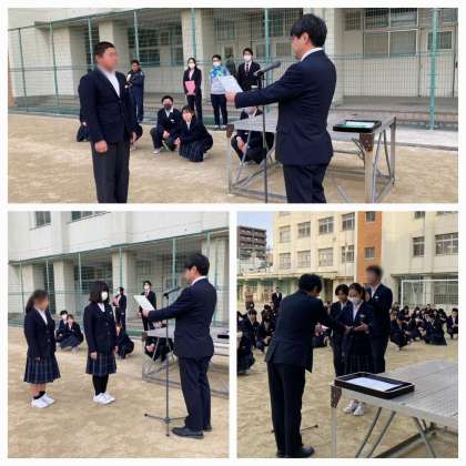 本日は朝からグラウンドで全校集会を行いました。野球部、バドミントン部、税の作文入賞の表彰伝達を行いました。