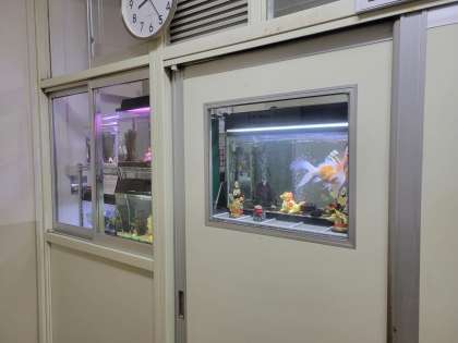 管理作業員室で、金魚、めだか、どじょうなどいろいろな生き物を飼育してくれています。